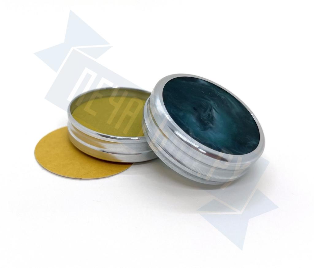 Металлическая оснастка для круглой печати со встроенной неокрашенной штемпельной подушкой. Благодаря встроенному магниту, крышку не нужно закручивать. В качестве декора на крышке и корпусе оснастки использованы вставки из акрила
