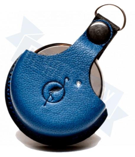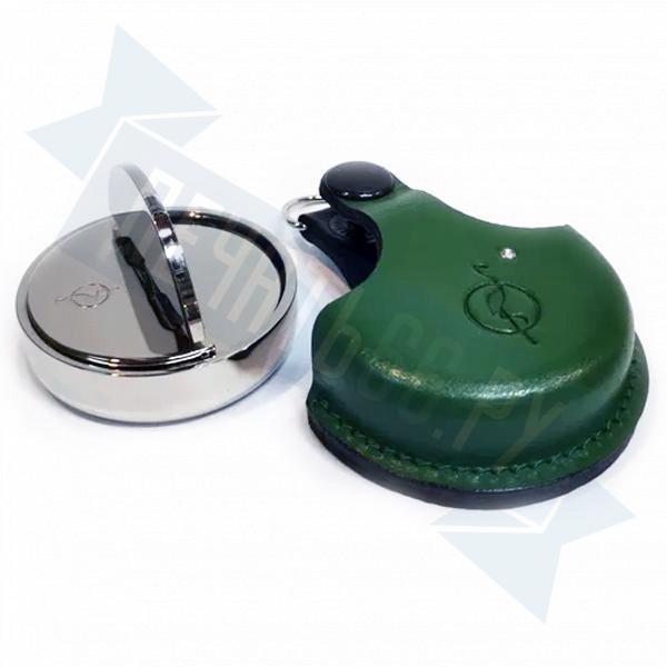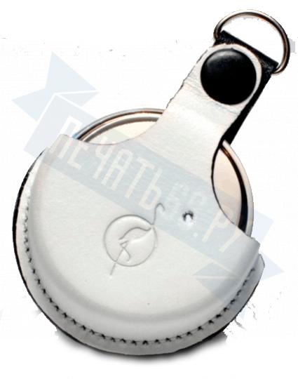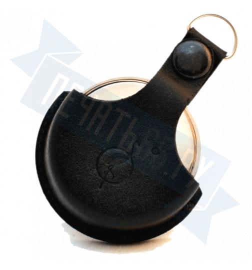 Карманная металлическая оснастка для круглой печати со встроенной штемпельной подушкой синего цвета, клеевым слоем для крепления клише печати. Никелированная. В комплекте чехольчик из натуральной кожи для возможности ношения на карабине.