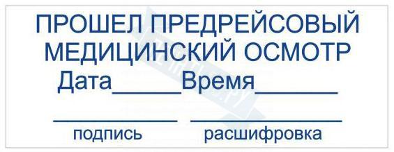 - Штамп ПРОШЕЛ ПРЕДРЕЙСОВЫЙ МЕДИЦИНСКИЙ ОСМОТР ВРЕМЯ ПОДПИСЬ на автоматической оснастке Trodat 3912 размером 47 х 18мм по цене 1098 рублей и еще 84 вида штампов со стандартными словами